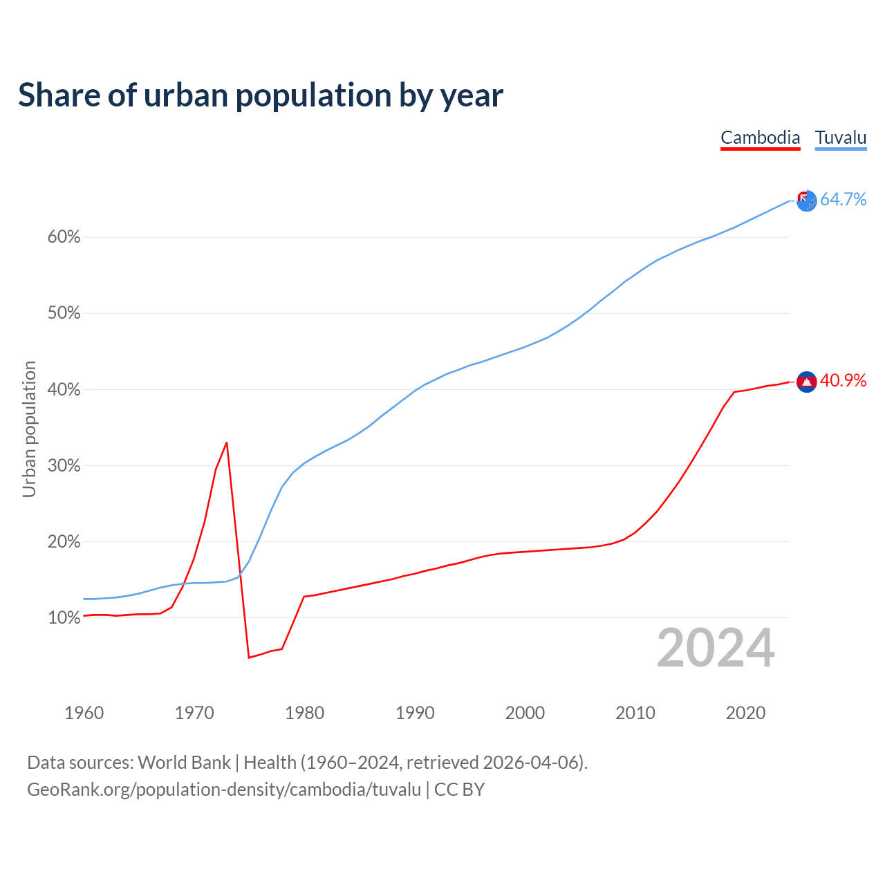 From 2006 to 2026, population density in Cambodia increased by 32.4%, compared to a 7.1% decline in Tuvalu.