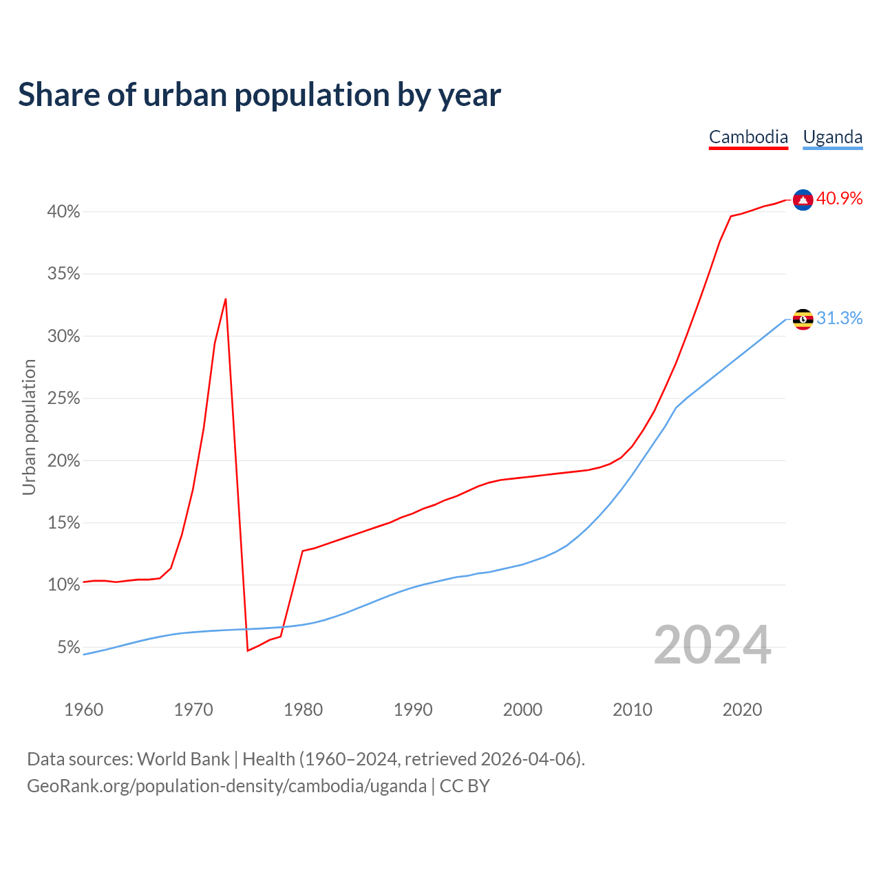 From 2004 to 2024, the share of urban population changed from 19% to 40.9% in Cambodia and from 13.1% to 31.3% in Uganda.