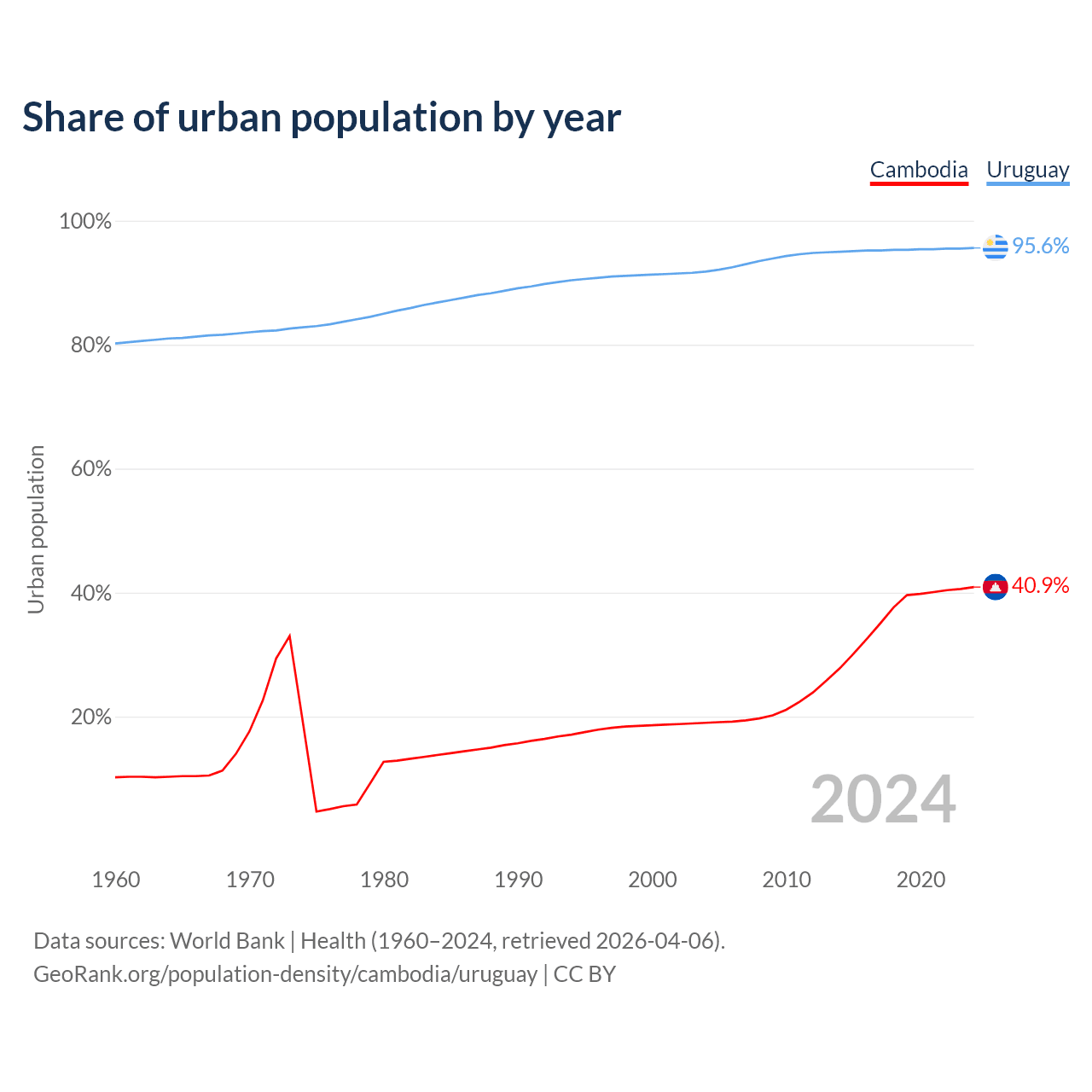 Cambodia has a population density of 265 people per square mile compared to 50.1 people in Uruguay. Cambodia has 110,475 sq ft of land per person vs 560,081 sq ft in Uruguay. Cambodia and Uruguay rank 92nd and 173rd by population density, respectively.