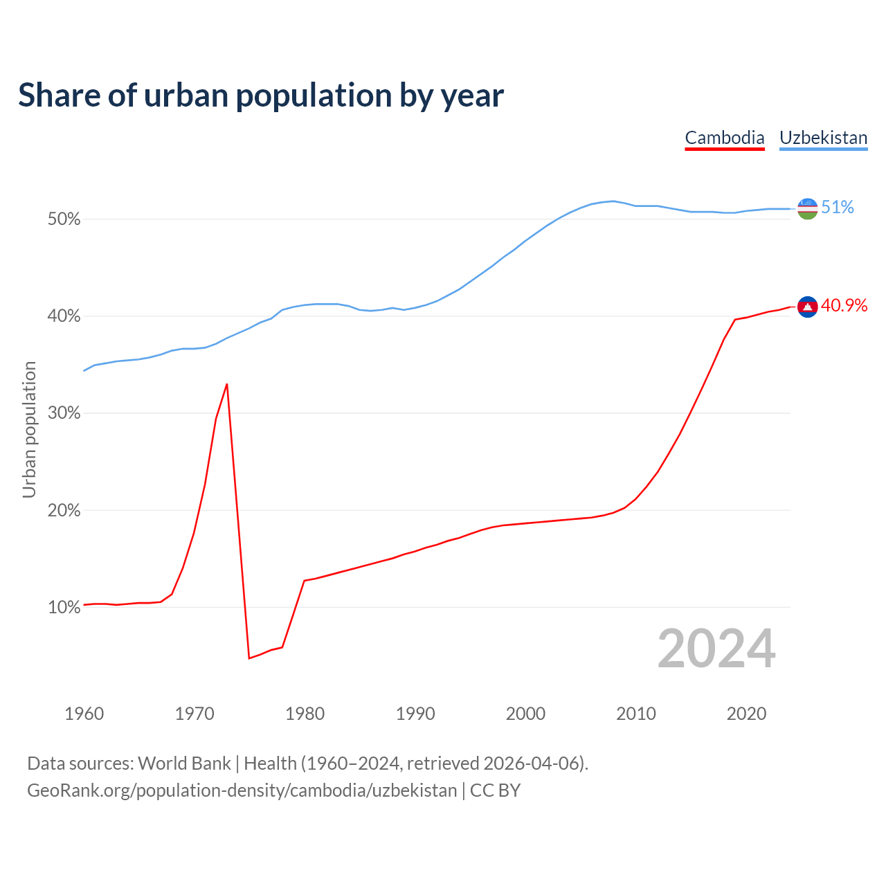 From 2004 to 2024, the share of urban population changed from 19% to 40.9% in Cambodia and from 50.6% to 51% in Uzbekistan.