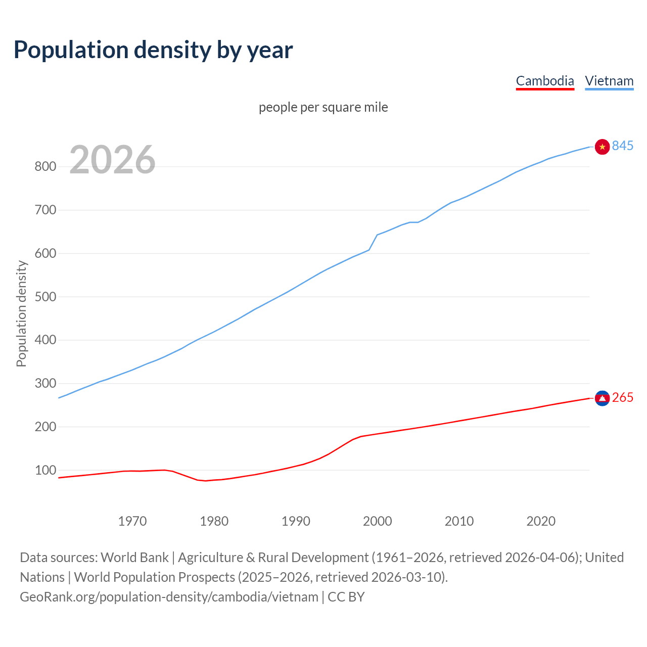 From 2006 to 2026, population density in Cambodia increased by 32.4%, compared to a 24.1% growth in Vietnam.