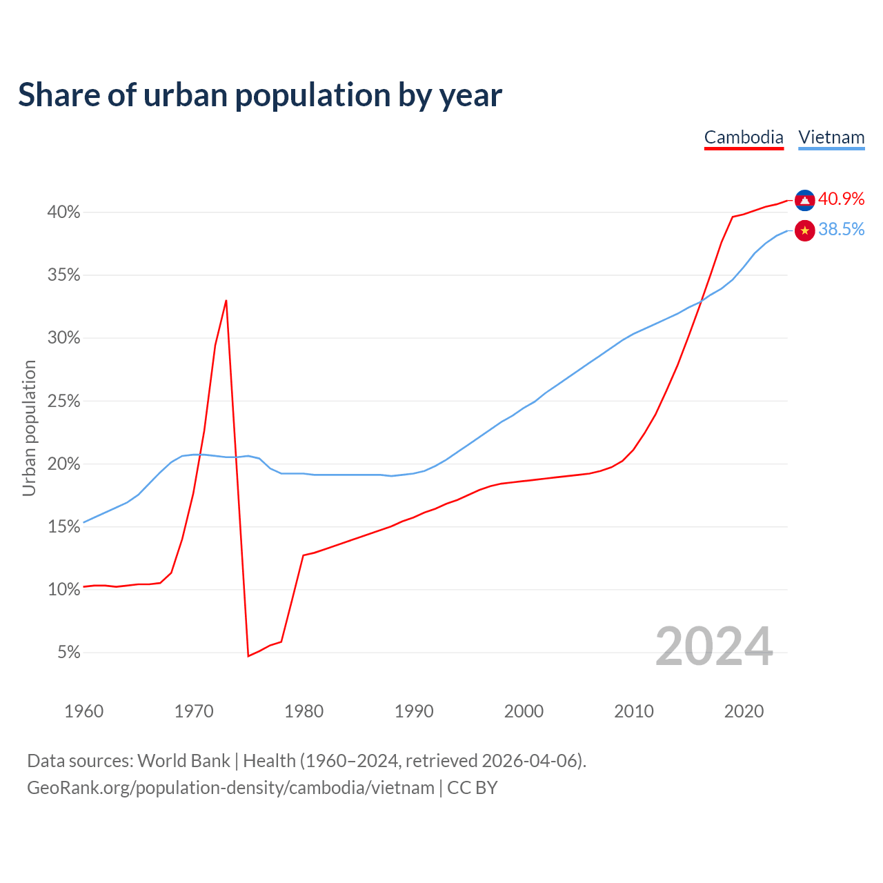 From 2004 to 2024, the share of urban population changed from 19% to 40.9% in Cambodia and from 26.8% to 38.5% in Vietnam.
