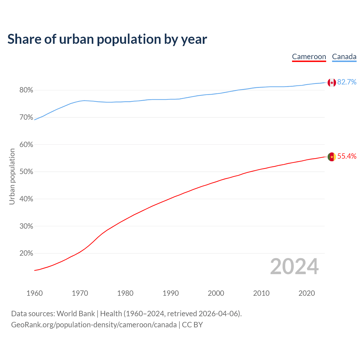 From 2004 to 2024, the share of urban population changed from 48.2% to 55.4% in Cameroon and from 79.7% to 82.7% in Canada.
