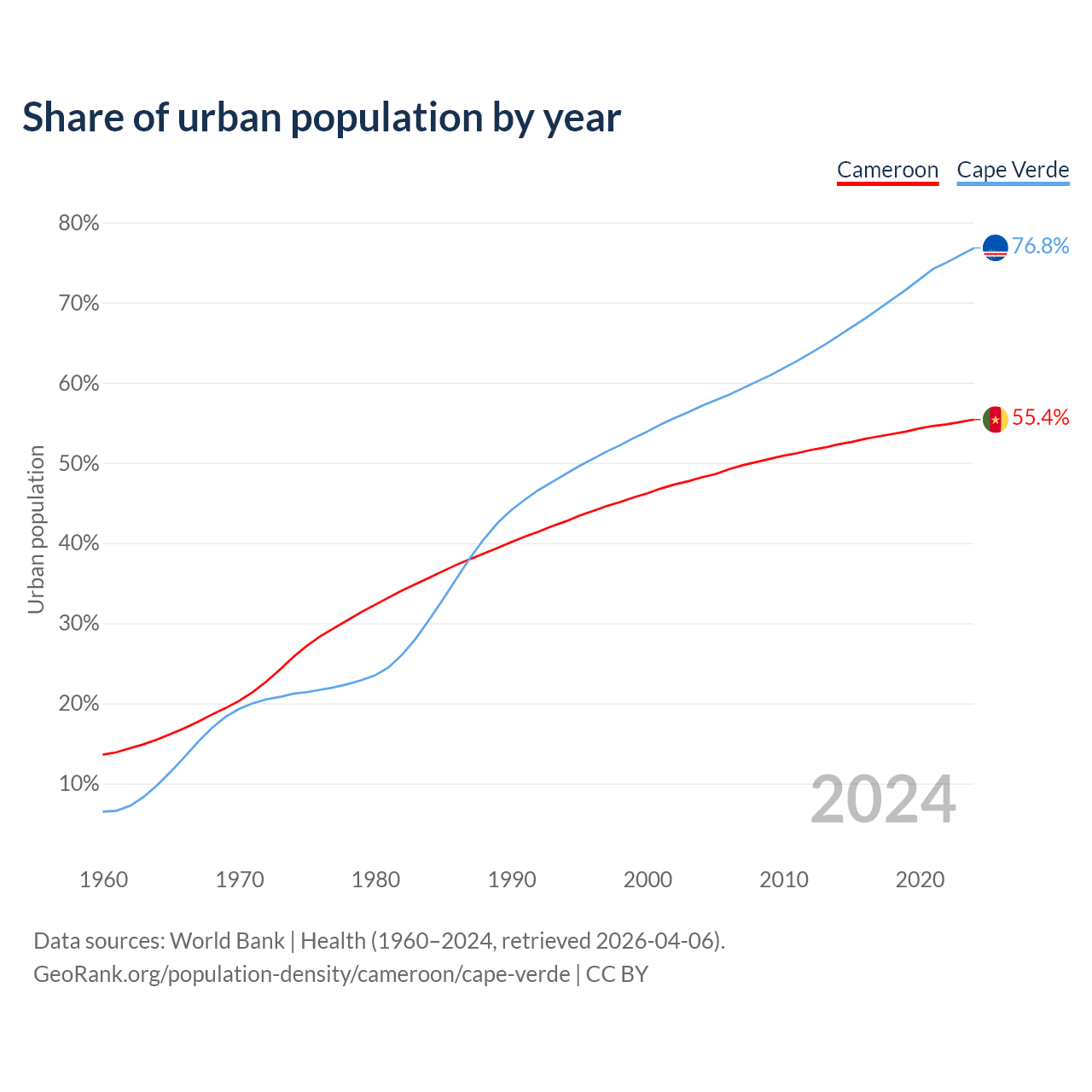 From 2004 to 2024, the share of urban population changed from 48.2% to 55.4% in Cameroon and from 57.1% to 76.8% in Cape Verde.