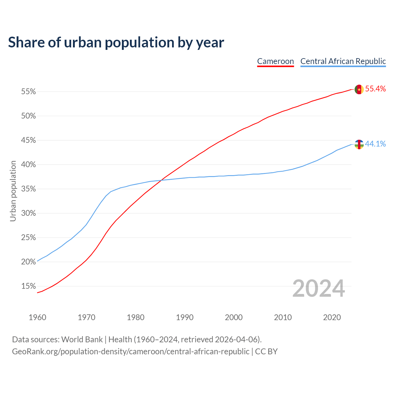From 2004 to 2024, the share of urban population changed from 48.2% to 55.4% in Cameroon and from 38% to 44.1% in the Central African Republic.