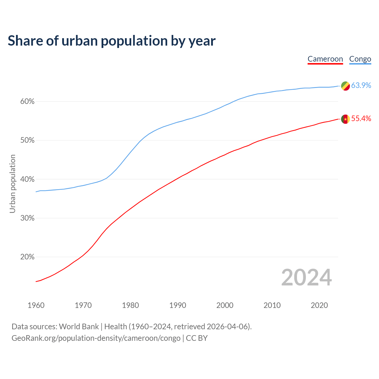 From 2004 to 2024, the share of urban population changed from 48.2% to 55.4% in Cameroon and from 60.9% to 63.9% in the Congo.