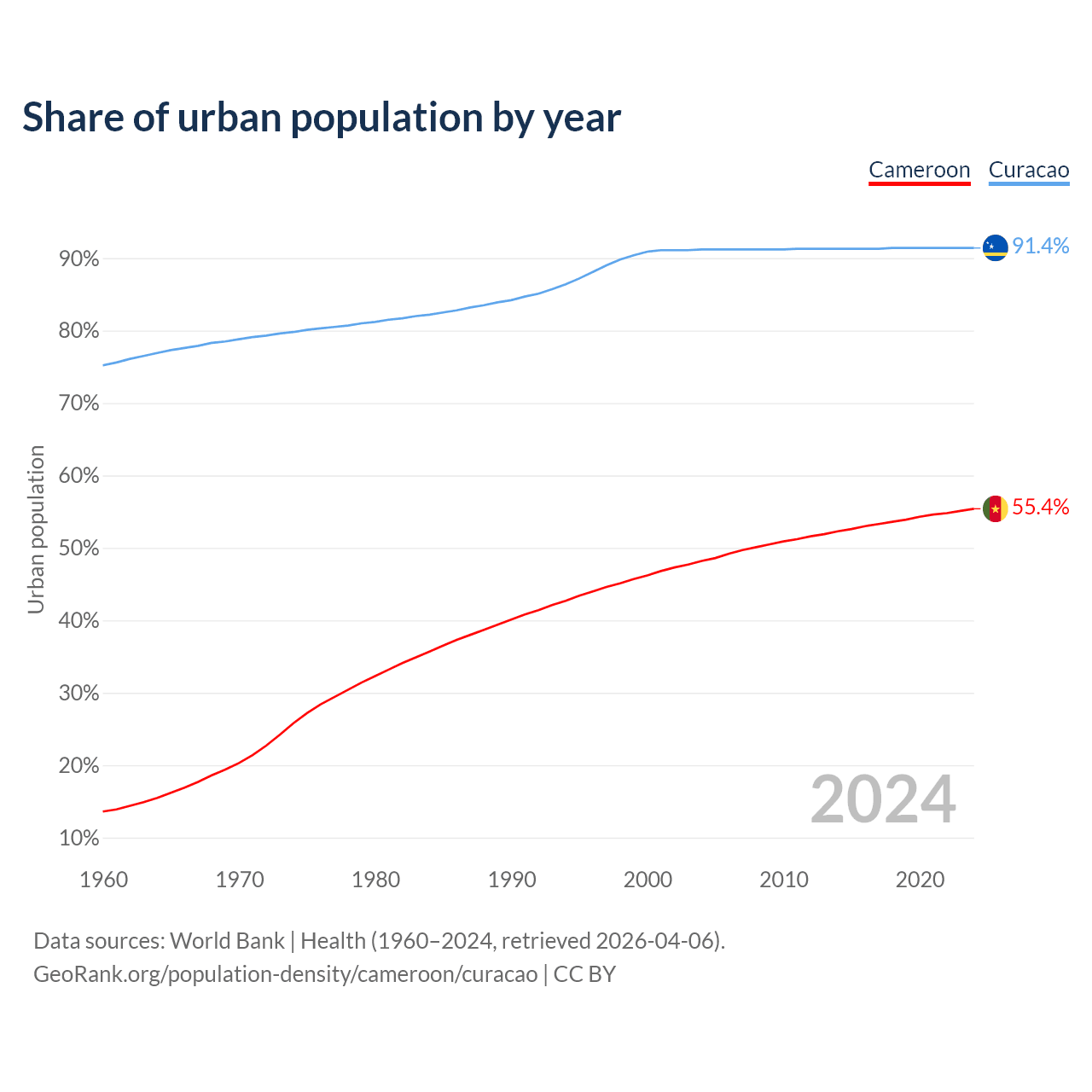 From 2004 to 2024, the share of urban population changed from 48.2% to 55.4% in Cameroon and from 91.2% to 91.4% in Curacao.