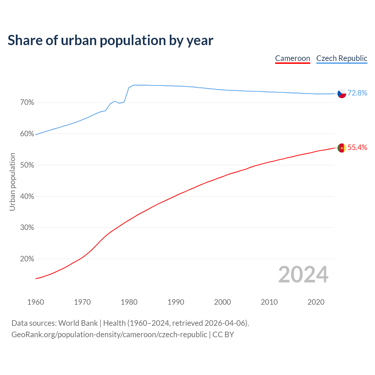 From 2004 to 2024, the share of urban population changed from 48.2% to 55.4% in Cameroon and from 73.7% to 72.8% in the Czech Republic.