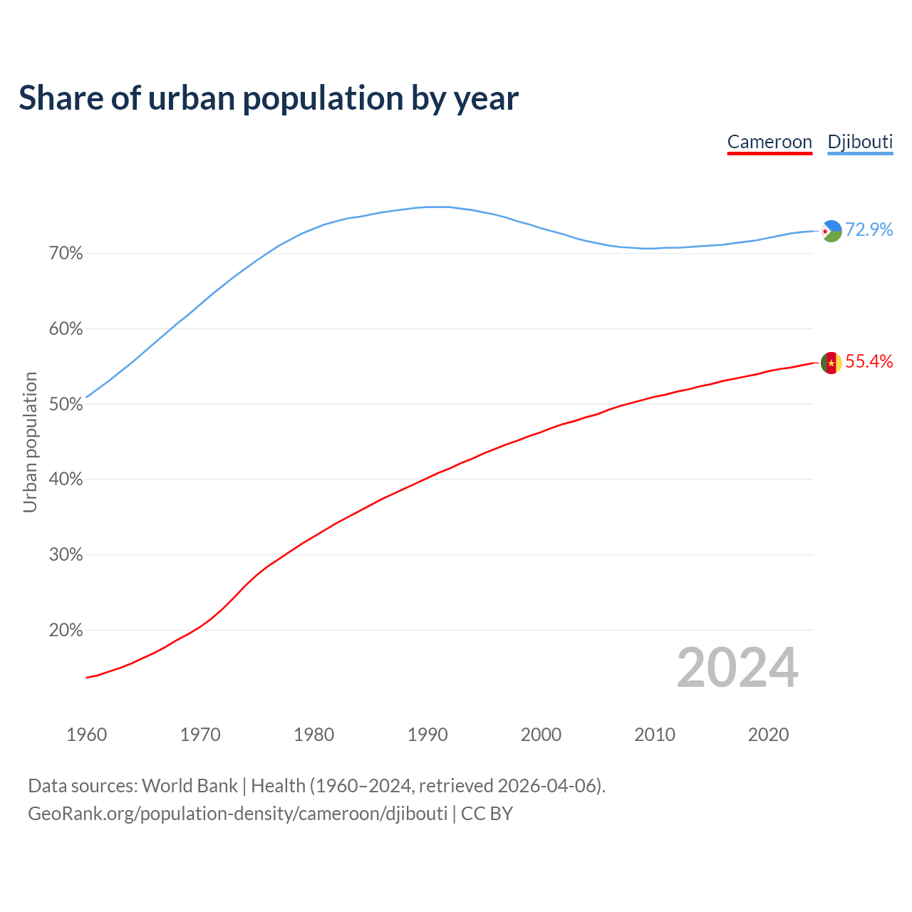 From 2004 to 2024, the share of urban population changed from 48.2% to 55.4% in Cameroon and from 71.6% to 72.9% in Djibouti.