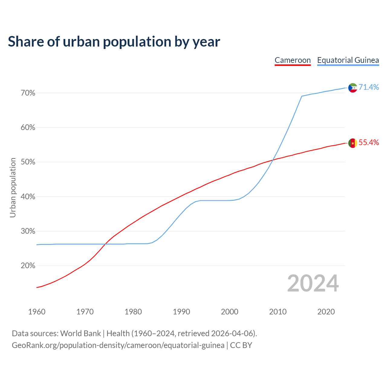 From 2004 to 2024, the share of urban population changed from 48.2% to 55.4% in Cameroon and from 40.9% to 71.4% in Equatorial Guinea.