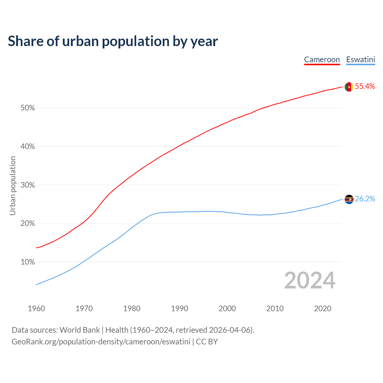 From 2004 to 2024, the share of urban population changed from 48.2% to 55.4% in Cameroon and from 22.3% to 26.2% in Eswatini.