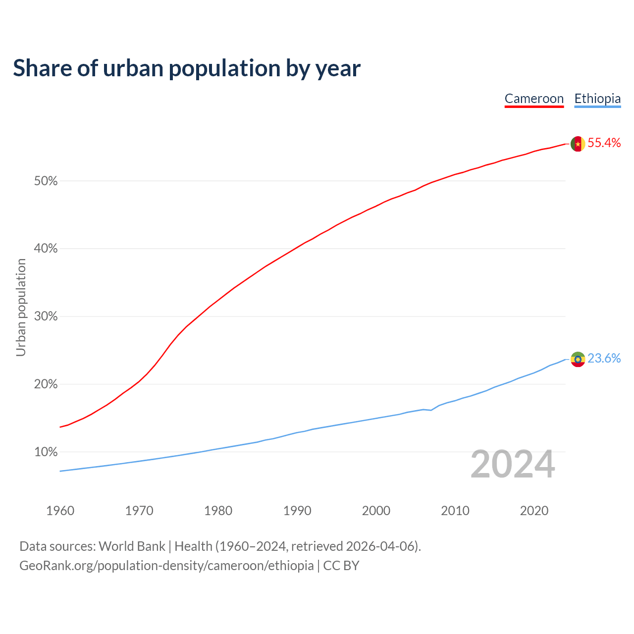 From 2004 to 2024, the share of urban population changed from 48.2% to 55.4% in Cameroon and from 15.8% to 23.6% in Ethiopia.