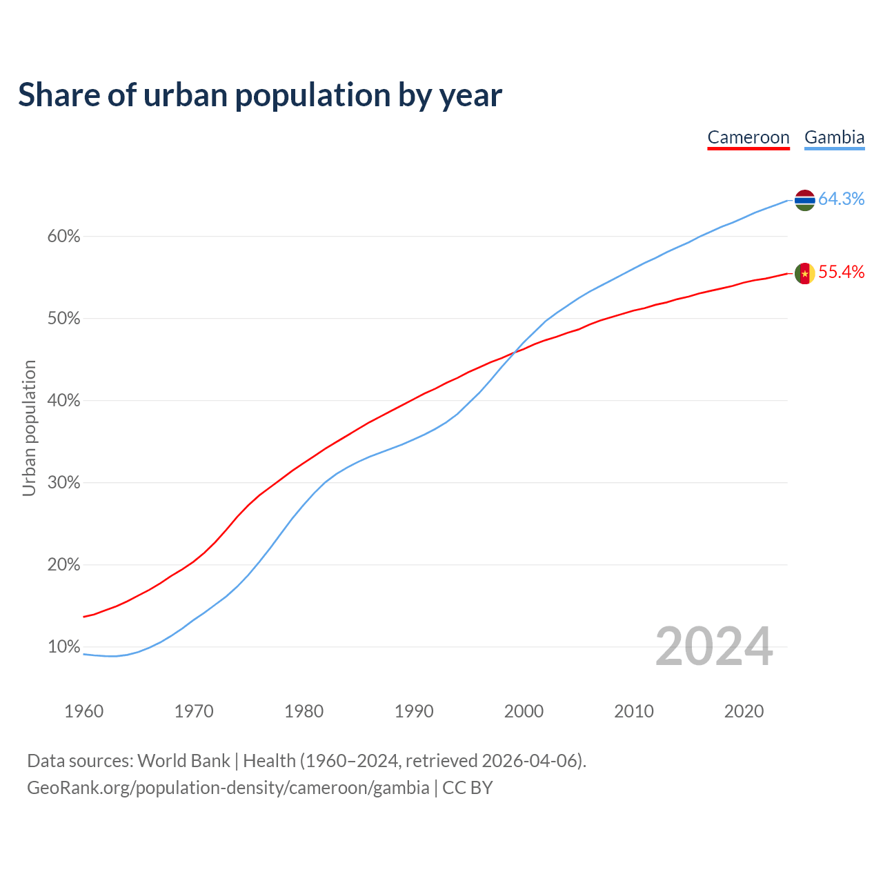 From 2004 to 2024, the share of urban population changed from 48.2% to 55.4% in Cameroon and from 51.5% to 64.3% in the Gambia.