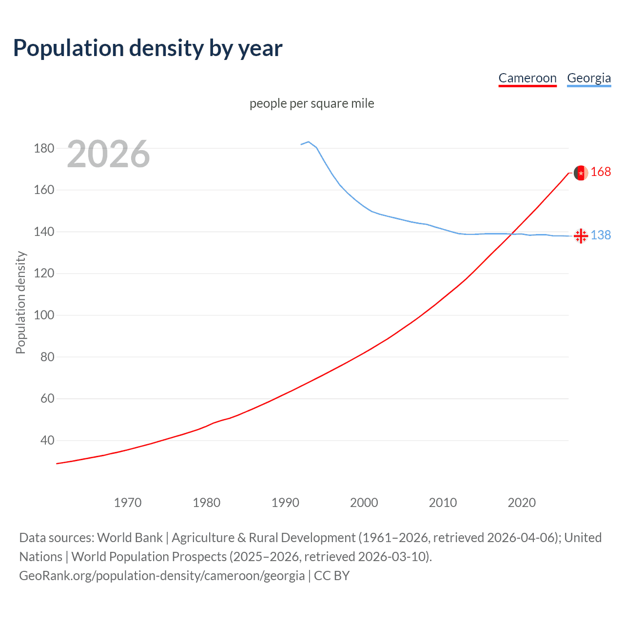 From 2006 to 2026, population density in Cameroon increased by 74.7%, compared to a 4.71% decline in Georgia.