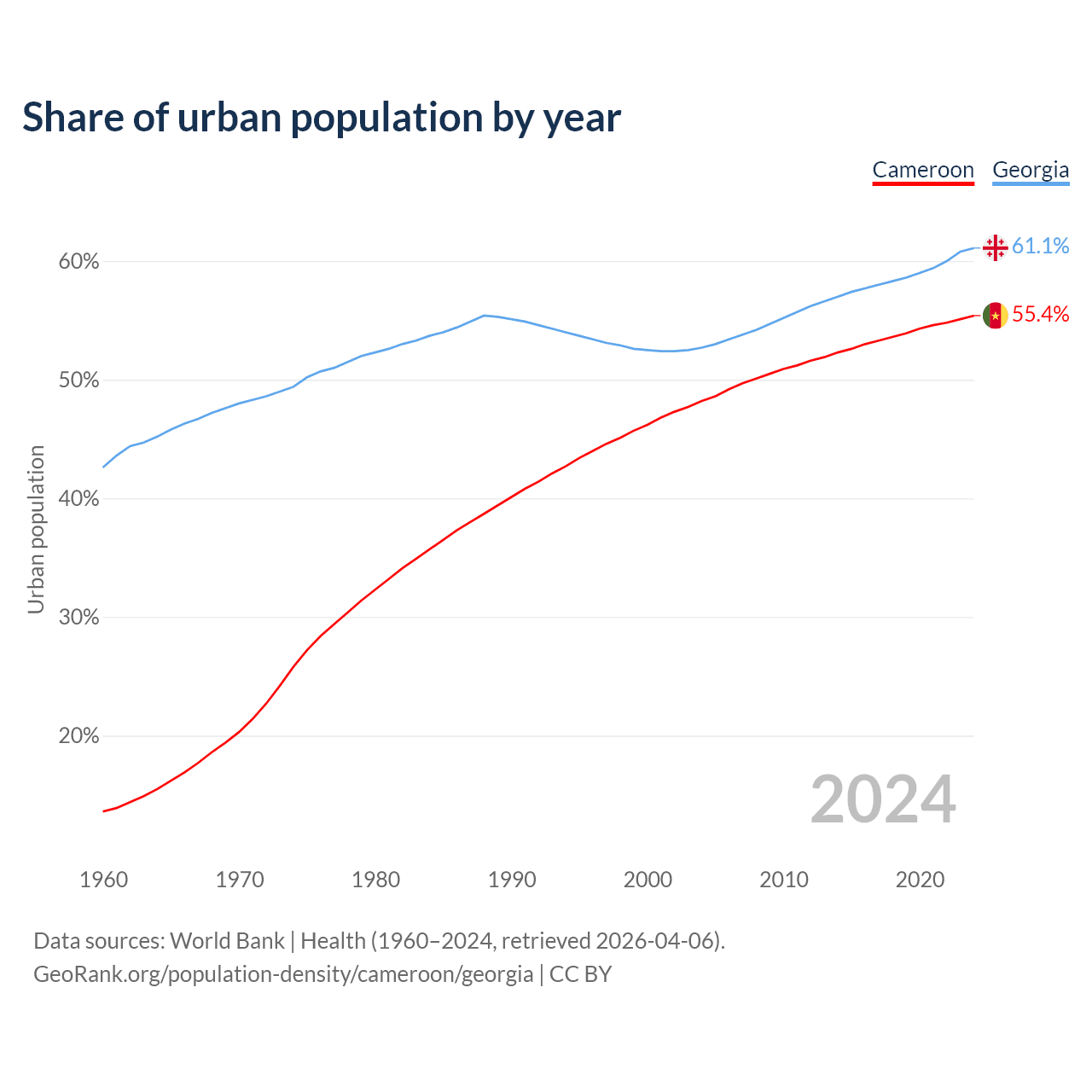 From 2004 to 2024, the share of urban population changed from 48.2% to 55.4% in Cameroon and from 52.7% to 61.1% in Georgia.