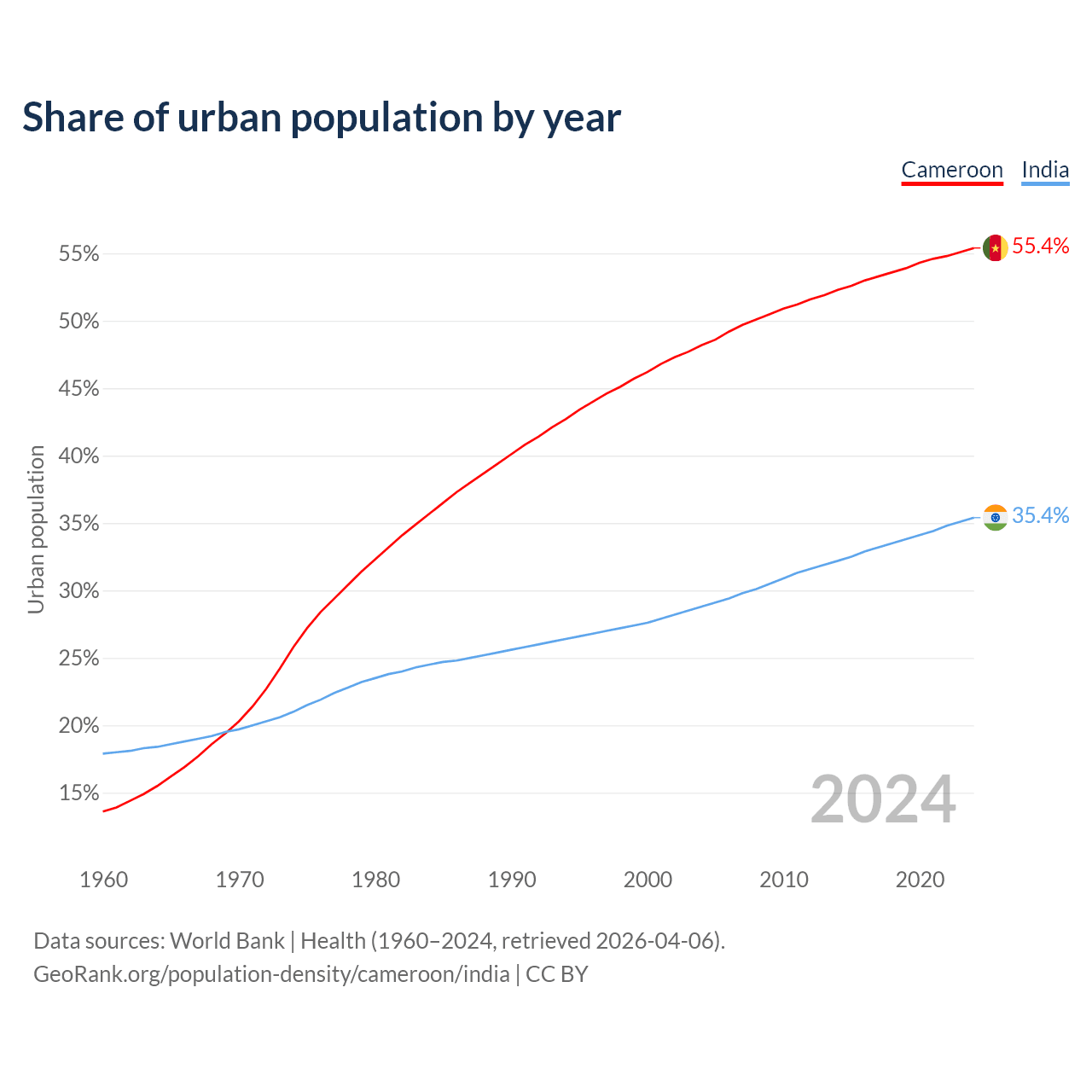 From 2004 to 2024, the share of urban population changed from 48.2% to 55.4% in Cameroon and from 28.8% to 35.4% in India.