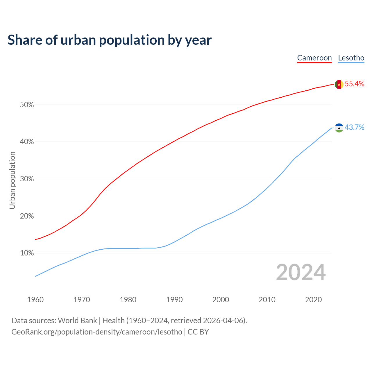 From 2004 to 2024, the share of urban population changed from 48.2% to 55.4% in Cameroon and from 21.8% to 43.7% in Lesotho.