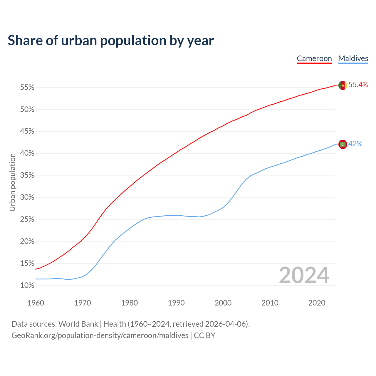 From 2004 to 2024, the share of urban population changed from 48.2% to 55.4% in Cameroon and from 32.9% to 42% in Maldives.