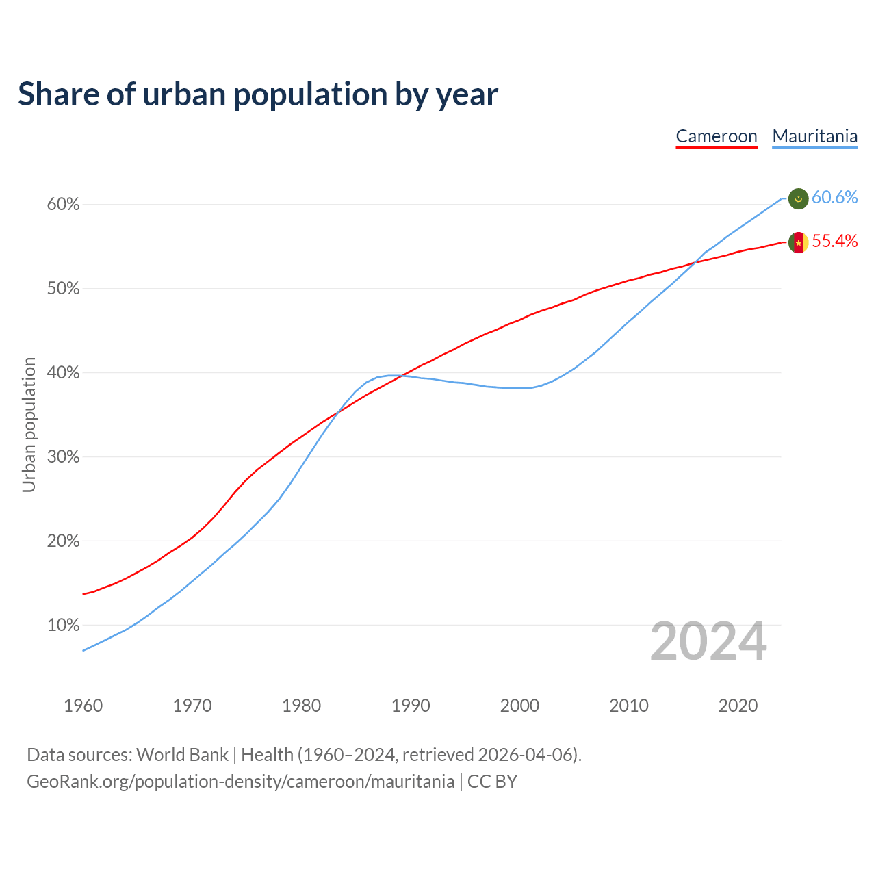 From 2004 to 2024, the share of urban population changed from 48.2% to 55.4% in Cameroon and from 39.6% to 60.6% in Mauritania.