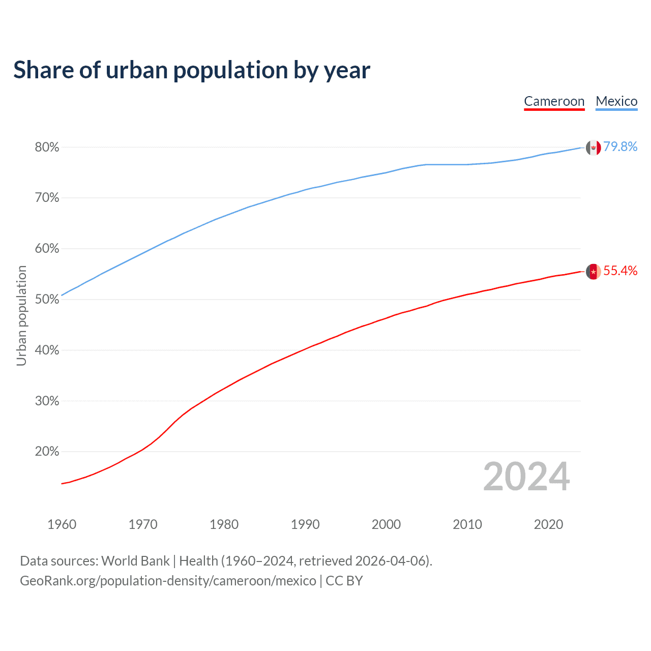 From 2004 to 2024, the share of urban population changed from 48.2% to 55.4% in Cameroon and from 76.3% to 79.8% in Mexico.