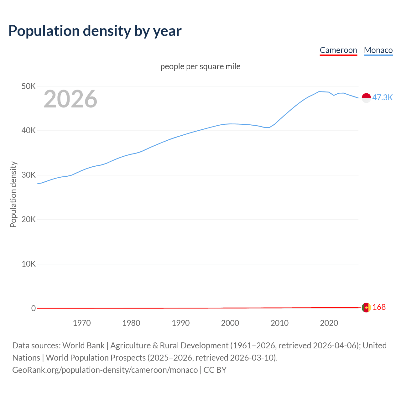 From 2006 to 2026, population density in Cameroon increased by 74.7%, compared to a 15.5% growth in Monaco.