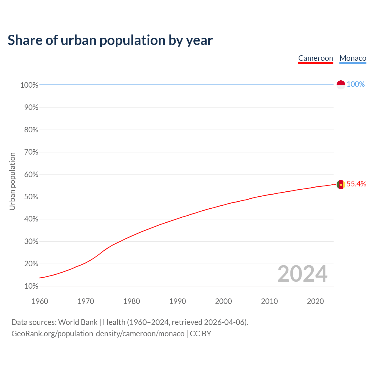 From 2004 to 2024, the share of urban population changed from 48.2% to 55.4% in Cameroon and from 100% to 100% in Monaco.