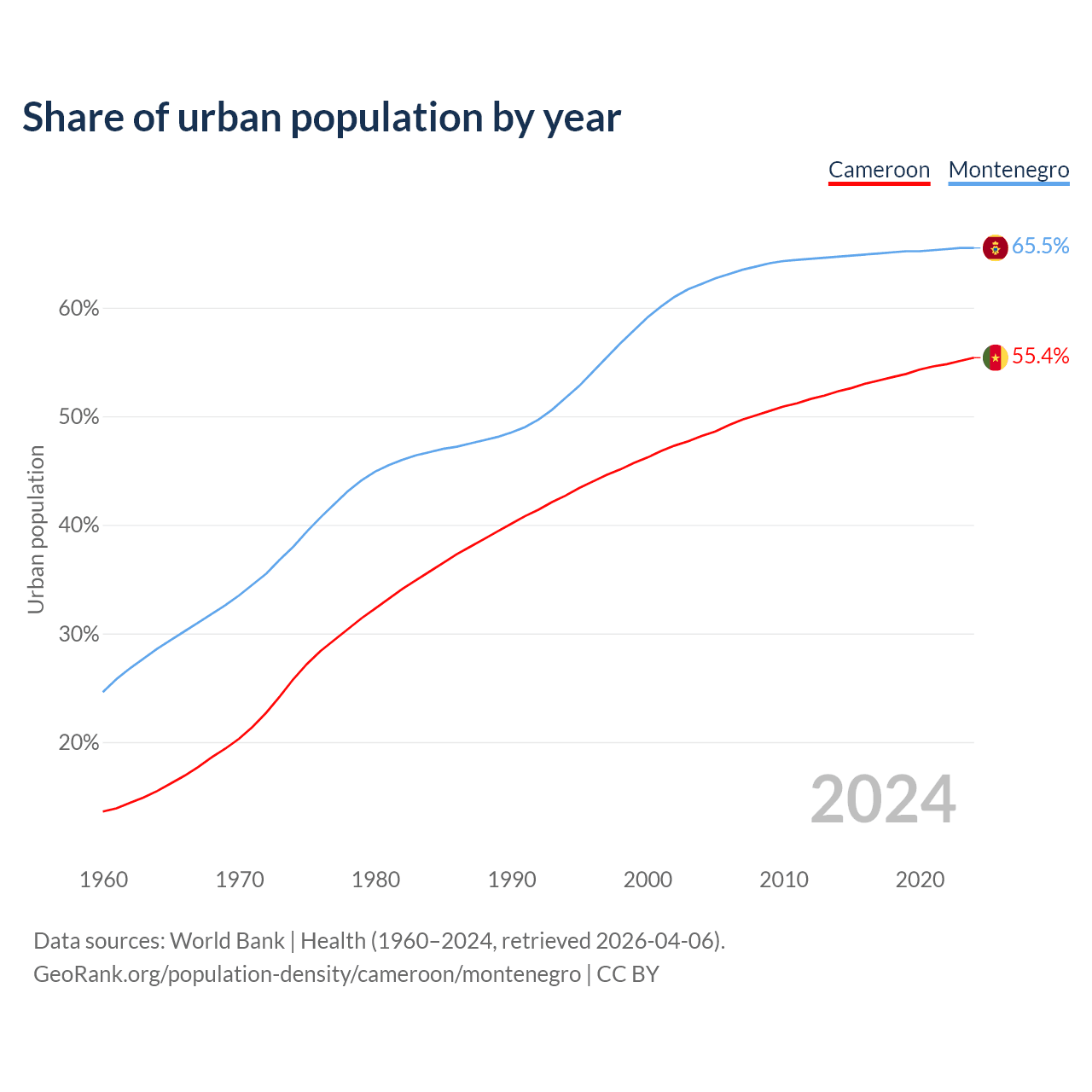From 2004 to 2024, the share of urban population changed from 48.2% to 55.4% in Cameroon and from 62.2% to 65.5% in Montenegro.