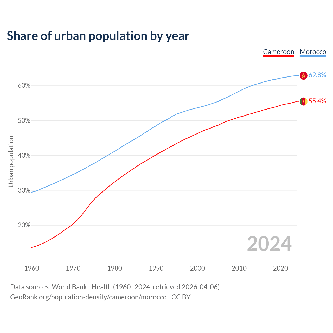From 2004 to 2024, the share of urban population changed from 48.2% to 55.4% in Cameroon and from 55% to 62.8% in Morocco.