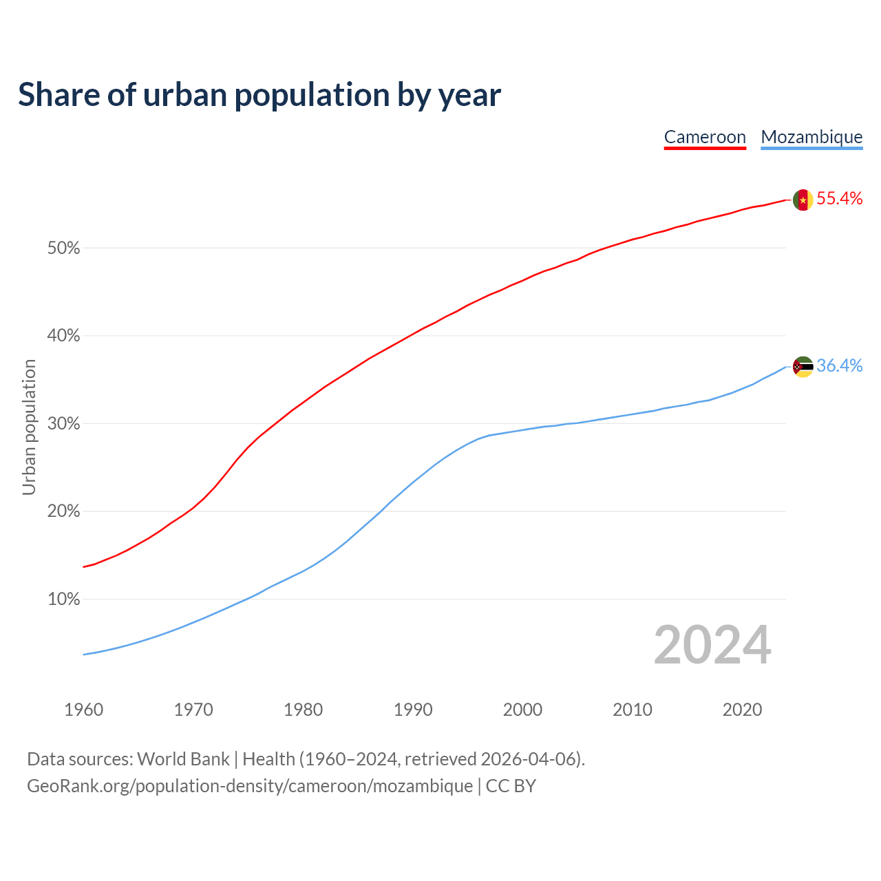 From 2004 to 2024, the share of urban population changed from 48.2% to 55.4% in Cameroon and from 29.9% to 36.4% in Mozambique.