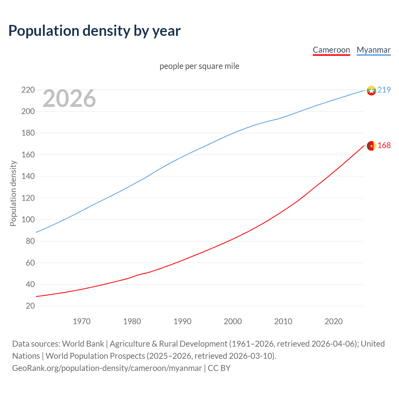From 2006 to 2026, population density in Cameroon increased by 74.7%, compared to a 15.7% growth in Myanmar.