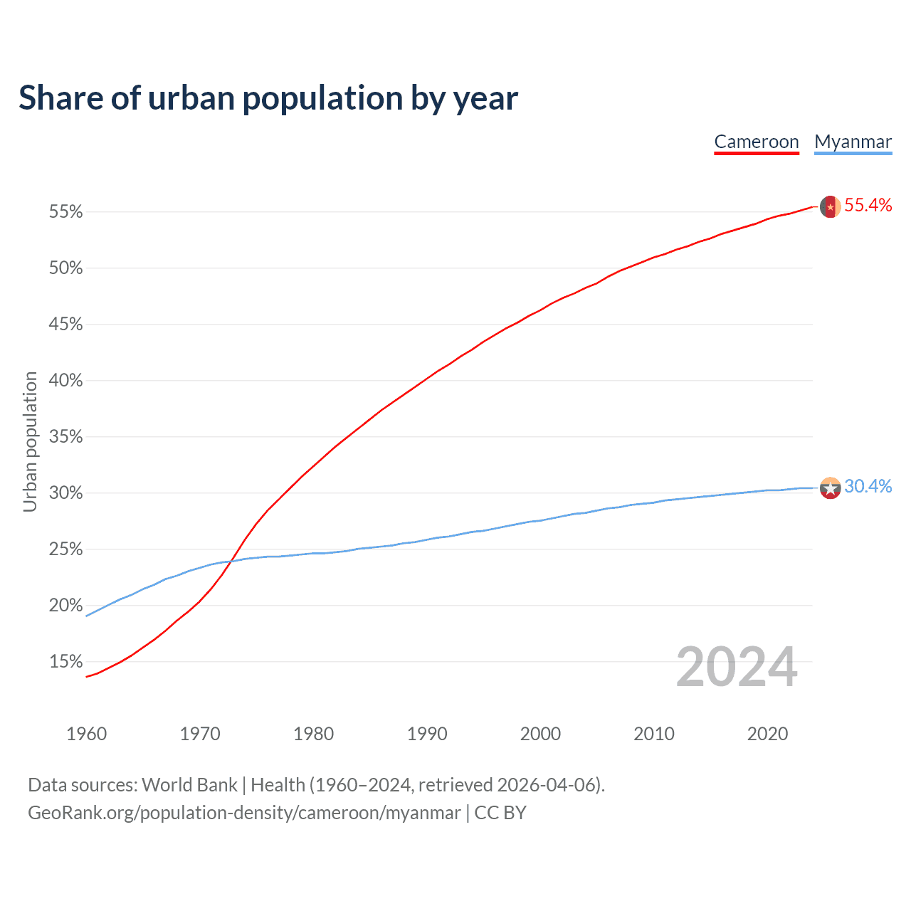 From 2004 to 2024, the share of urban population changed from 48.2% to 55.4% in Cameroon and from 28.2% to 30.4% in Myanmar.