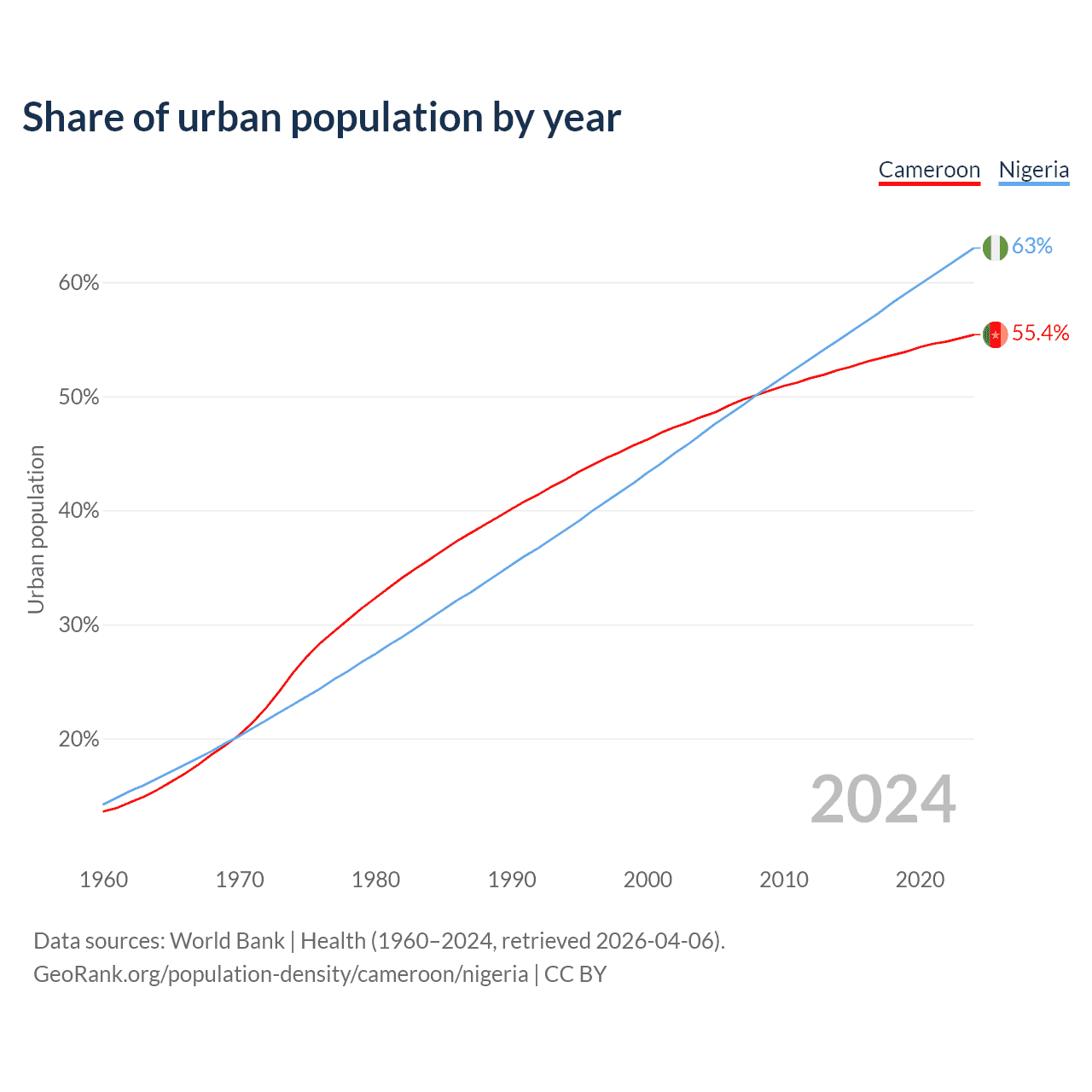 From 2004 to 2024, the share of urban population changed from 48.2% to 55.4% in Cameroon and from 46.7% to 63% in Nigeria.