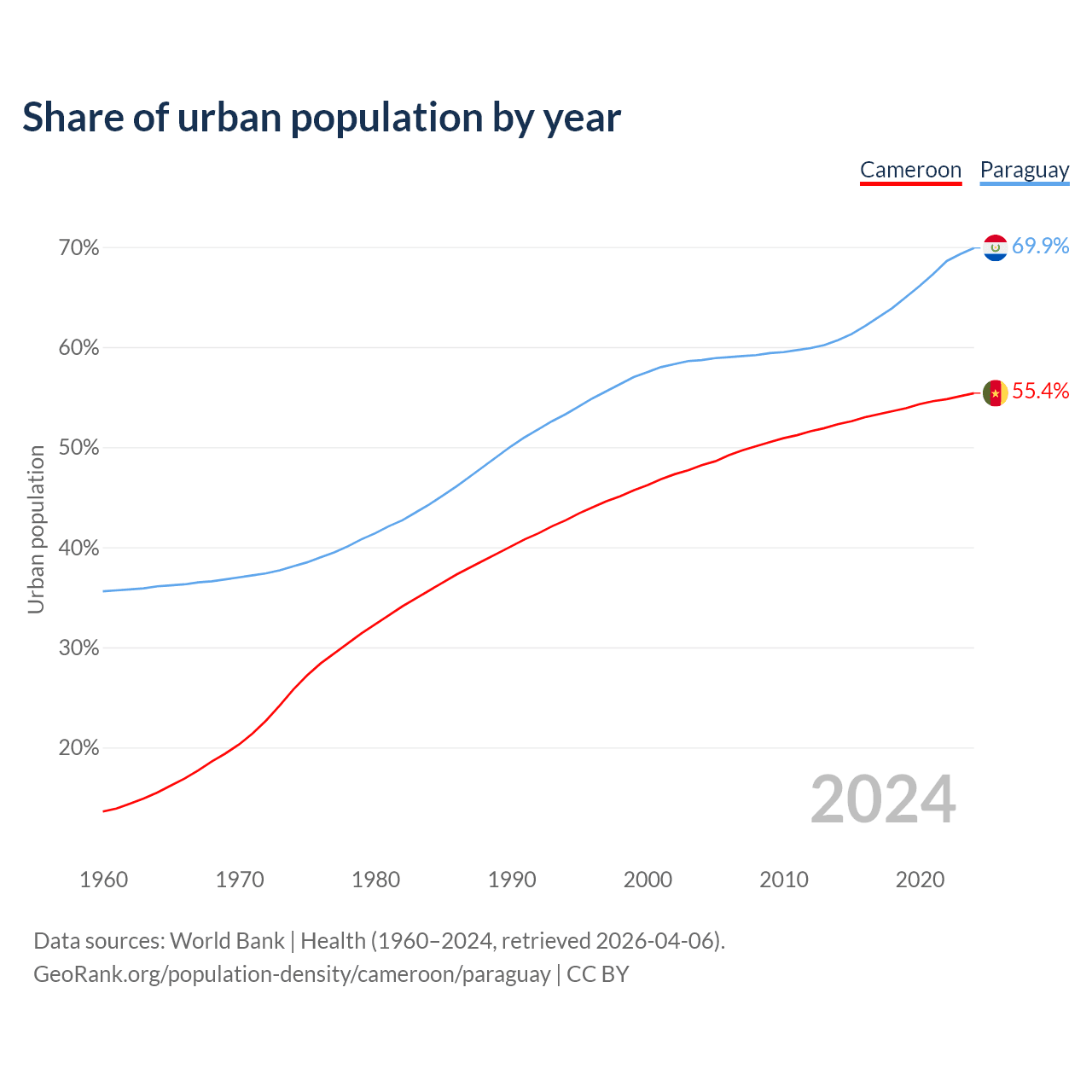 From 2004 to 2024, the share of urban population changed from 48.2% to 55.4% in Cameroon and from 58.7% to 69.9% in Paraguay.
