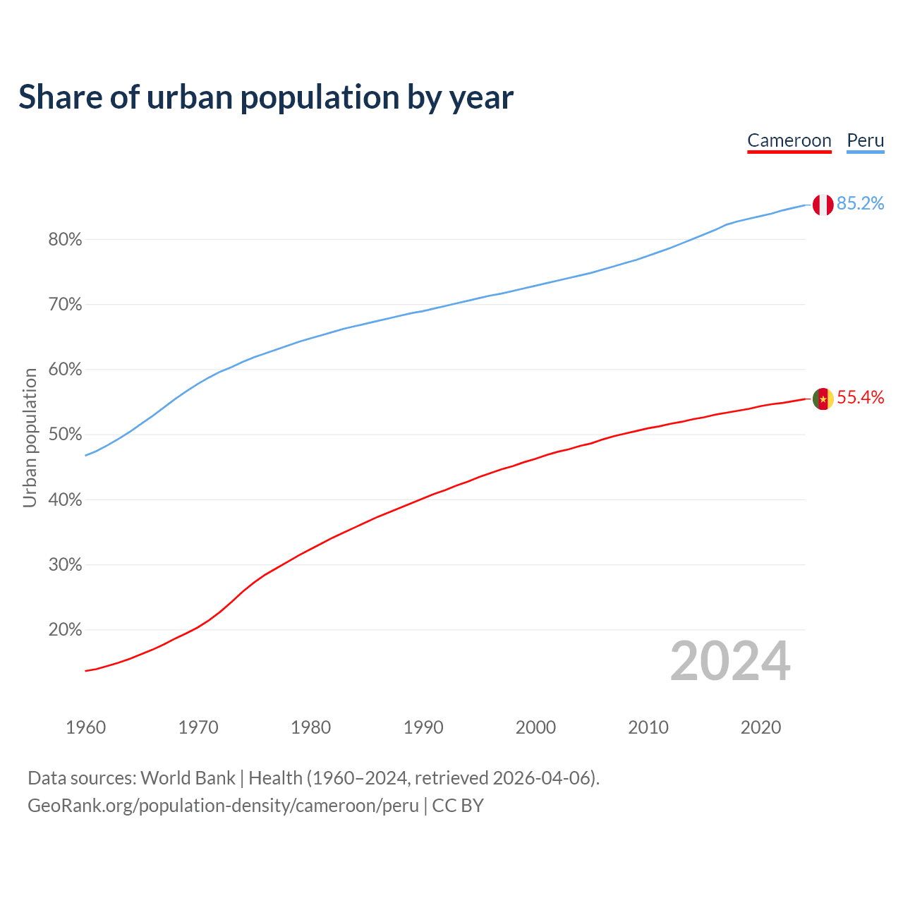 From 2006 to 2026, population density in Cameroon increased by 74.7%, compared to a 23.4% growth in Peru.