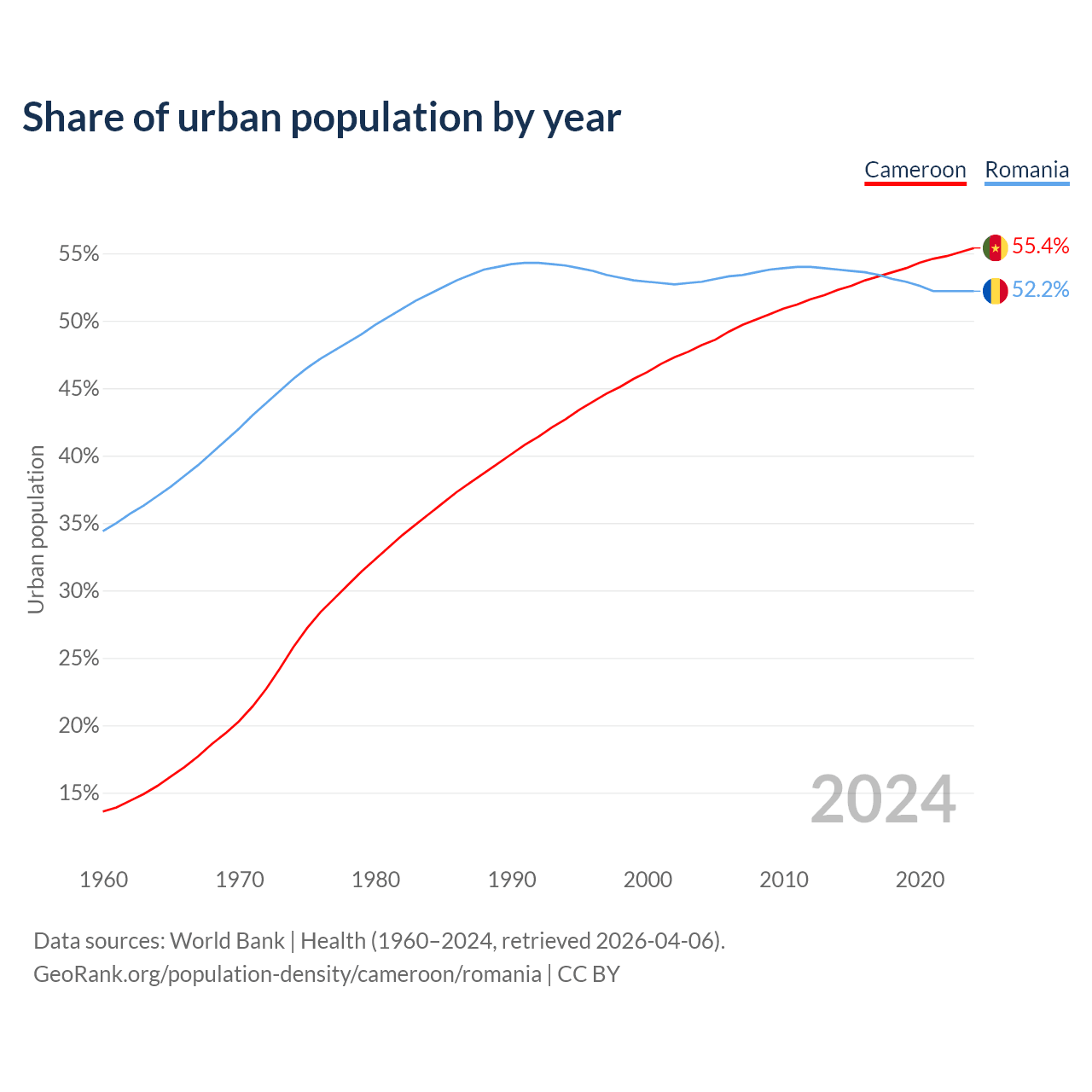 From 2004 to 2024, the share of urban population changed from 48.2% to 55.4% in Cameroon and from 52.9% to 52.2% in Romania.