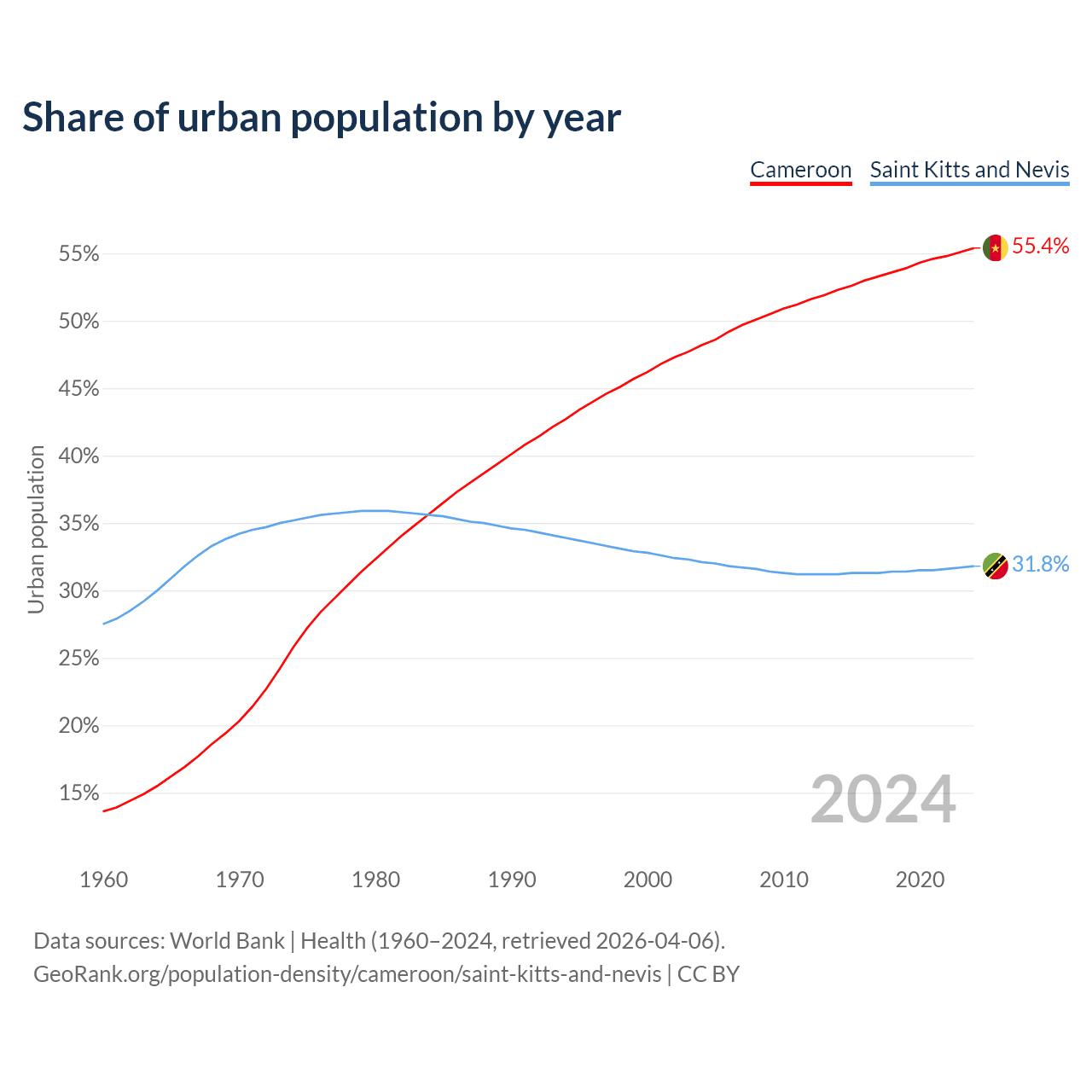 From 2004 to 2024, the share of urban population changed from 48.2% to 55.4% in Cameroon and from 32.1% to 31.8% in Saint Kitts and Nevis.