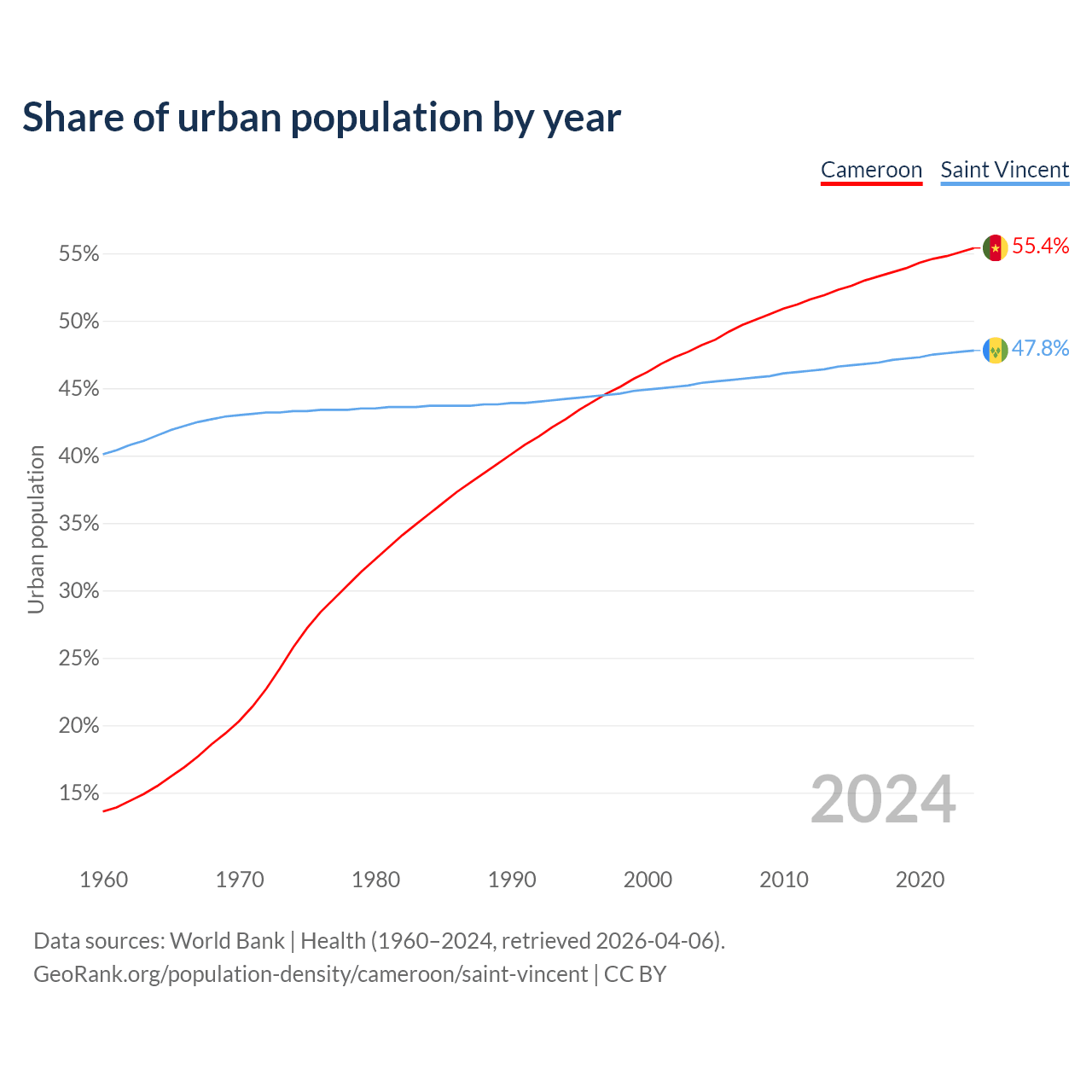 From 2004 to 2024, the share of urban population changed from 48.2% to 55.4% in Cameroon and from 45.4% to 47.8% in Saint Vincent.