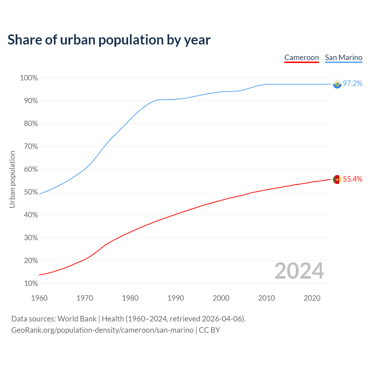 From 2004 to 2024, the share of urban population changed from 48.2% to 55.4% in Cameroon and from 94.2% to 97.2% in San Marino.