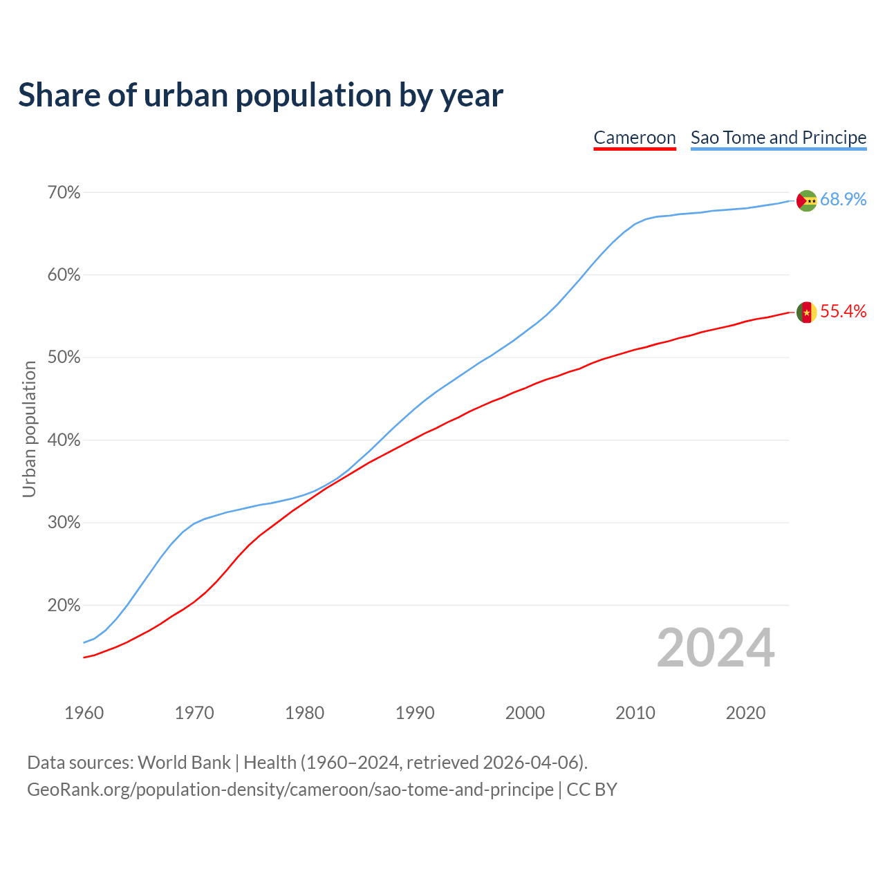 From 2004 to 2024, the share of urban population changed from 48.2% to 55.4% in Cameroon and from 57.9% to 68.9% in Sao Tome and Principe.