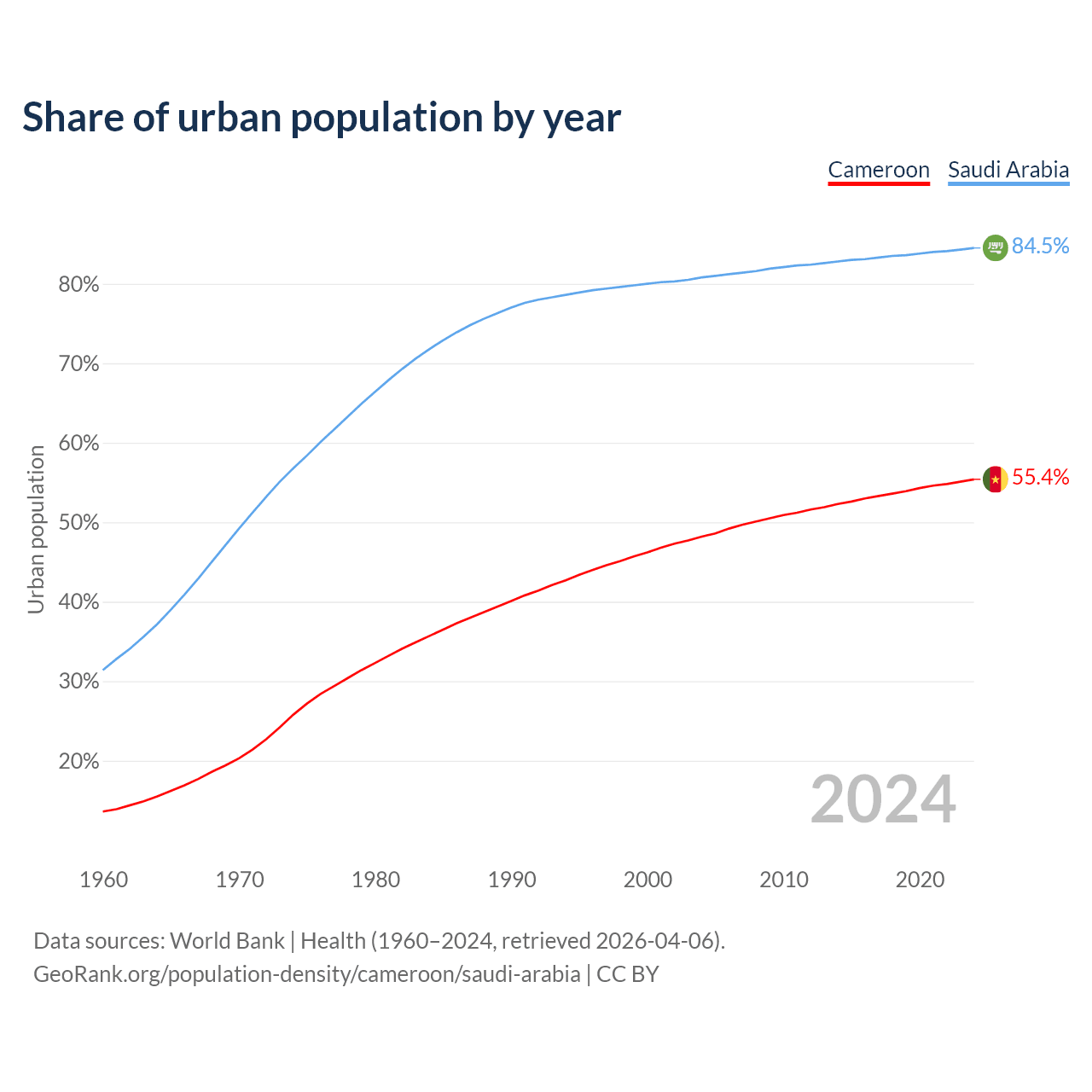 From 2004 to 2024, the share of urban population changed from 48.2% to 55.4% in Cameroon and from 80.8% to 84.5% in Saudi Arabia.