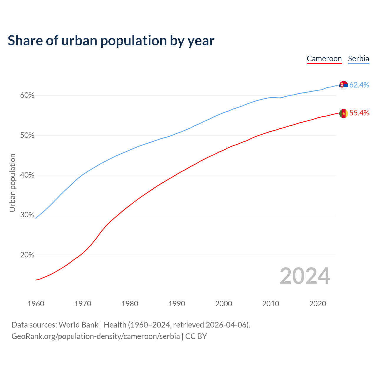 From 2004 to 2024, the share of urban population changed from 48.2% to 55.4% in Cameroon and from 57.3% to 62.4% in Serbia.