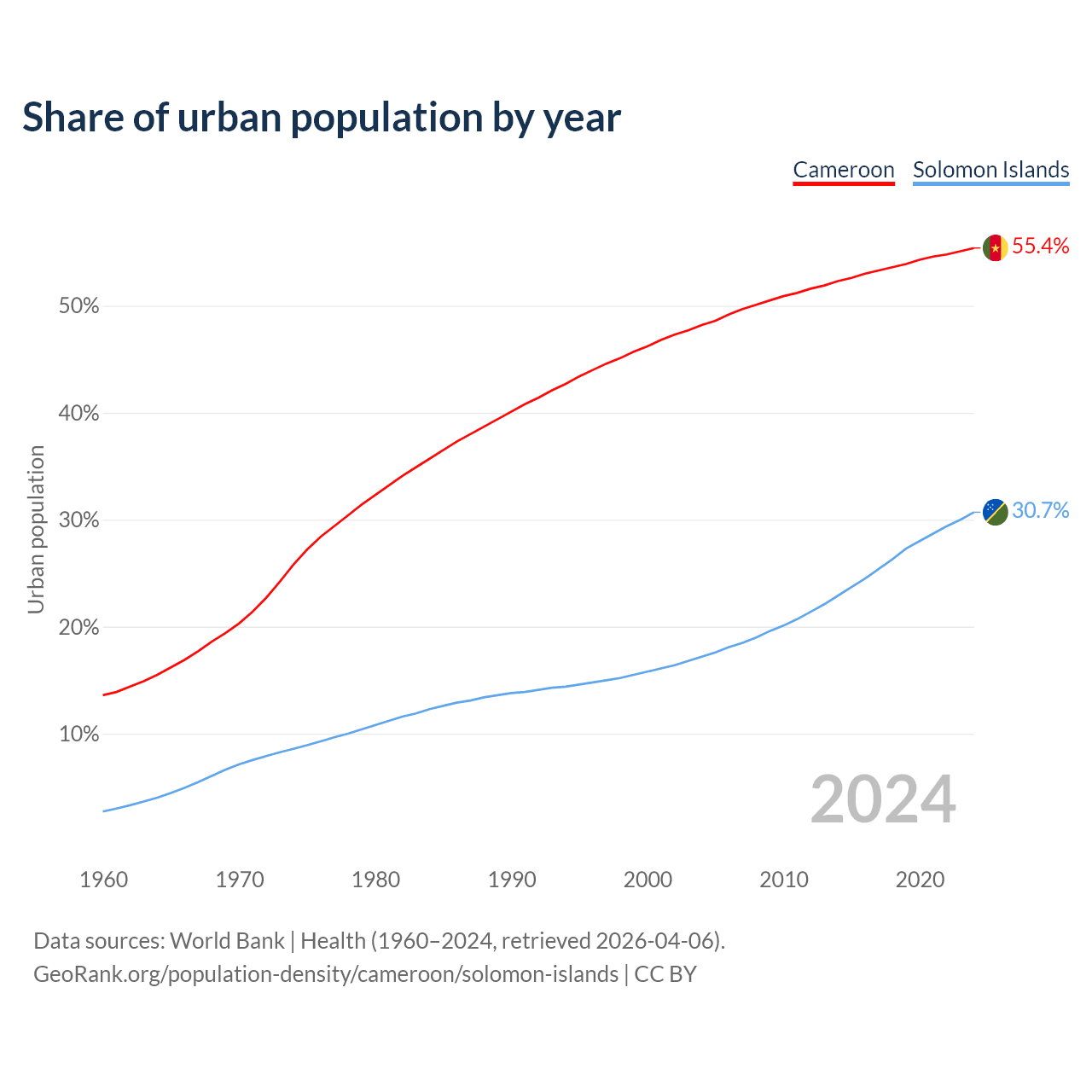From 2004 to 2024, the share of urban population changed from 48.2% to 55.4% in Cameroon and from 17.2% to 30.7% in the Solomon Islands.