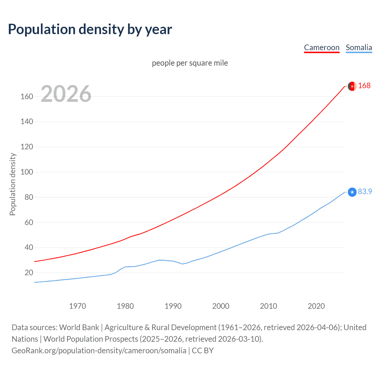 From 2006 to 2026, population density in Cameroon increased by 74.7%, compared to a 85.2% growth in Somalia.