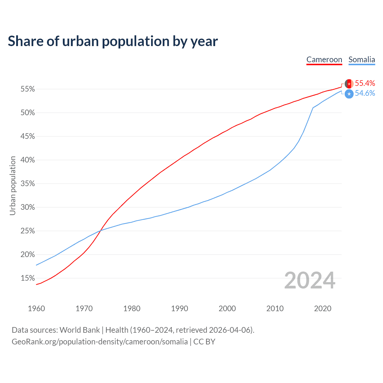 From 2004 to 2024, the share of urban population changed from 48.2% to 55.4% in Cameroon and from 35% to 54.6% in Somalia.