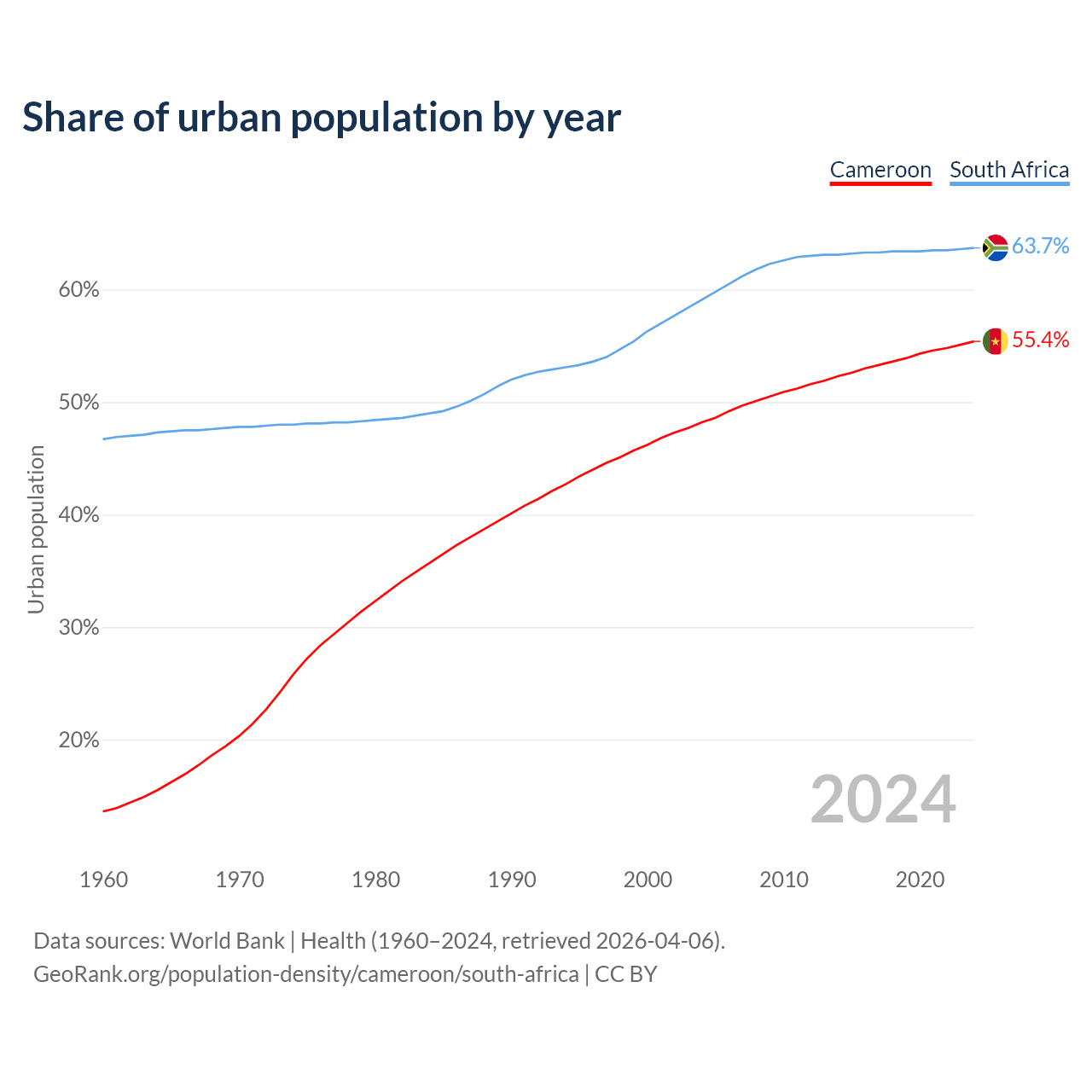 From 2004 to 2024, the share of urban population changed from 48.2% to 55.4% in Cameroon and from 59.1% to 63.7% in South Africa.