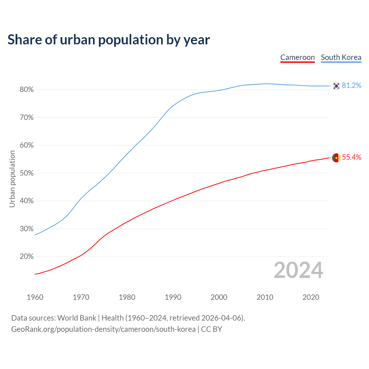 From 2004 to 2024, the share of urban population changed from 48.2% to 55.4% in Cameroon and from 81.1% to 81.2% in South Korea.