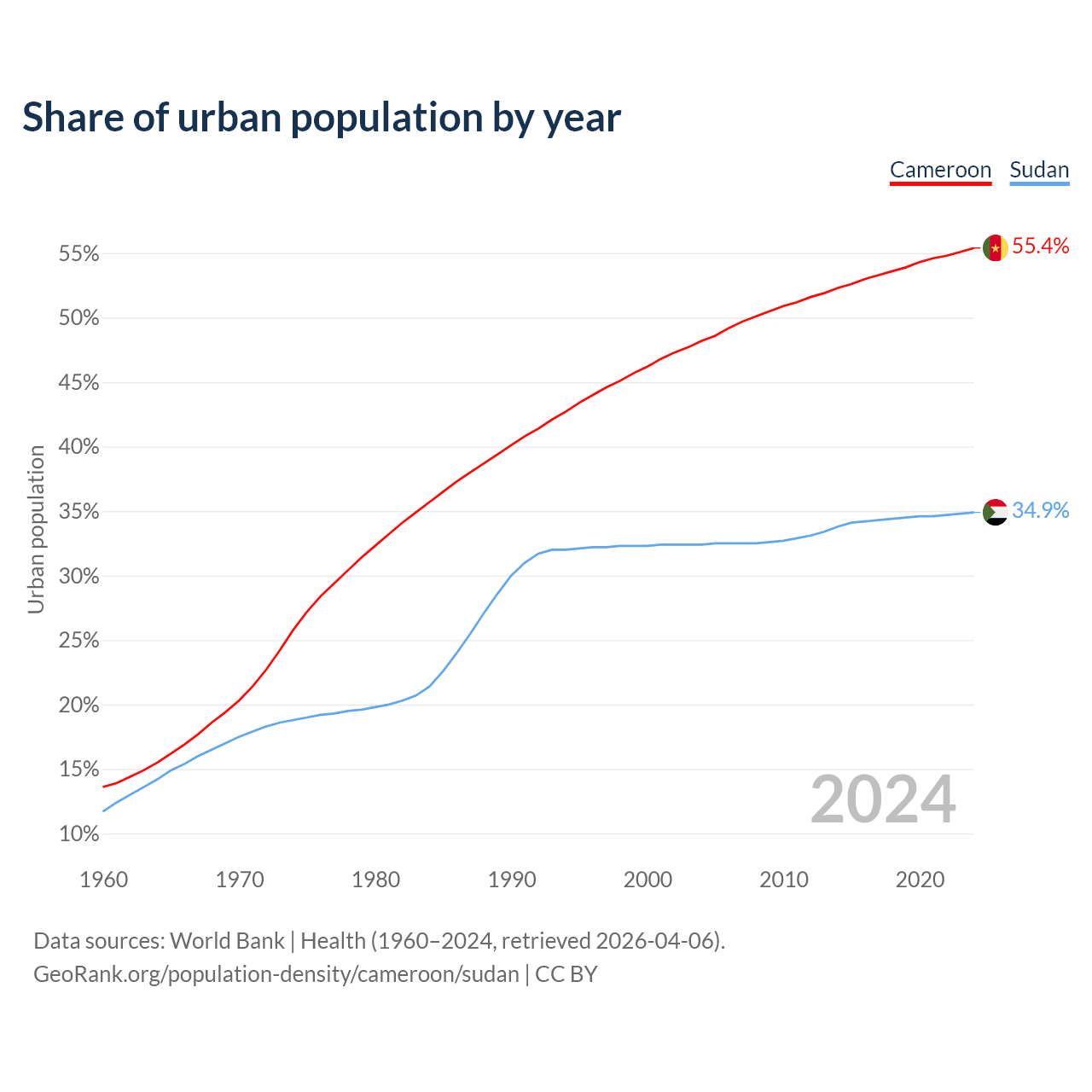 From 2004 to 2024, the share of urban population changed from 48.2% to 55.4% in Cameroon and from 32.4% to 34.9% in Sudan.