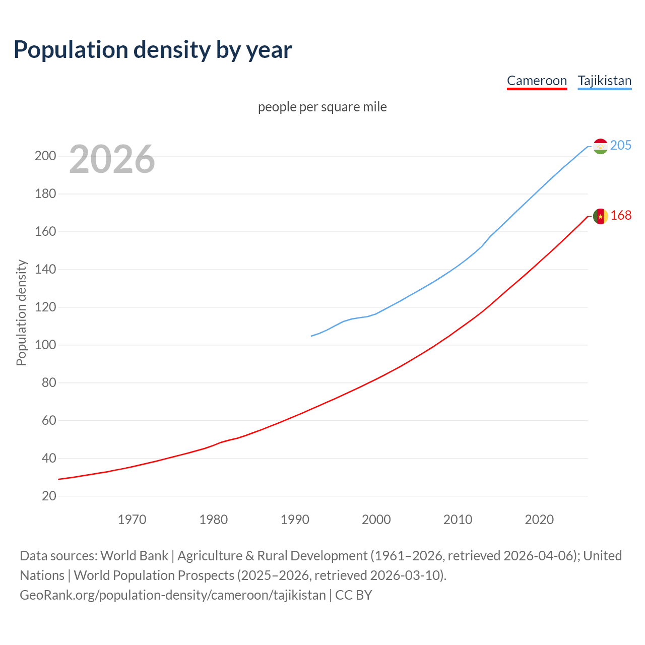 From 2006 to 2026, population density in Cameroon increased by 74.7%, compared to a 57% growth in Tajikistan.