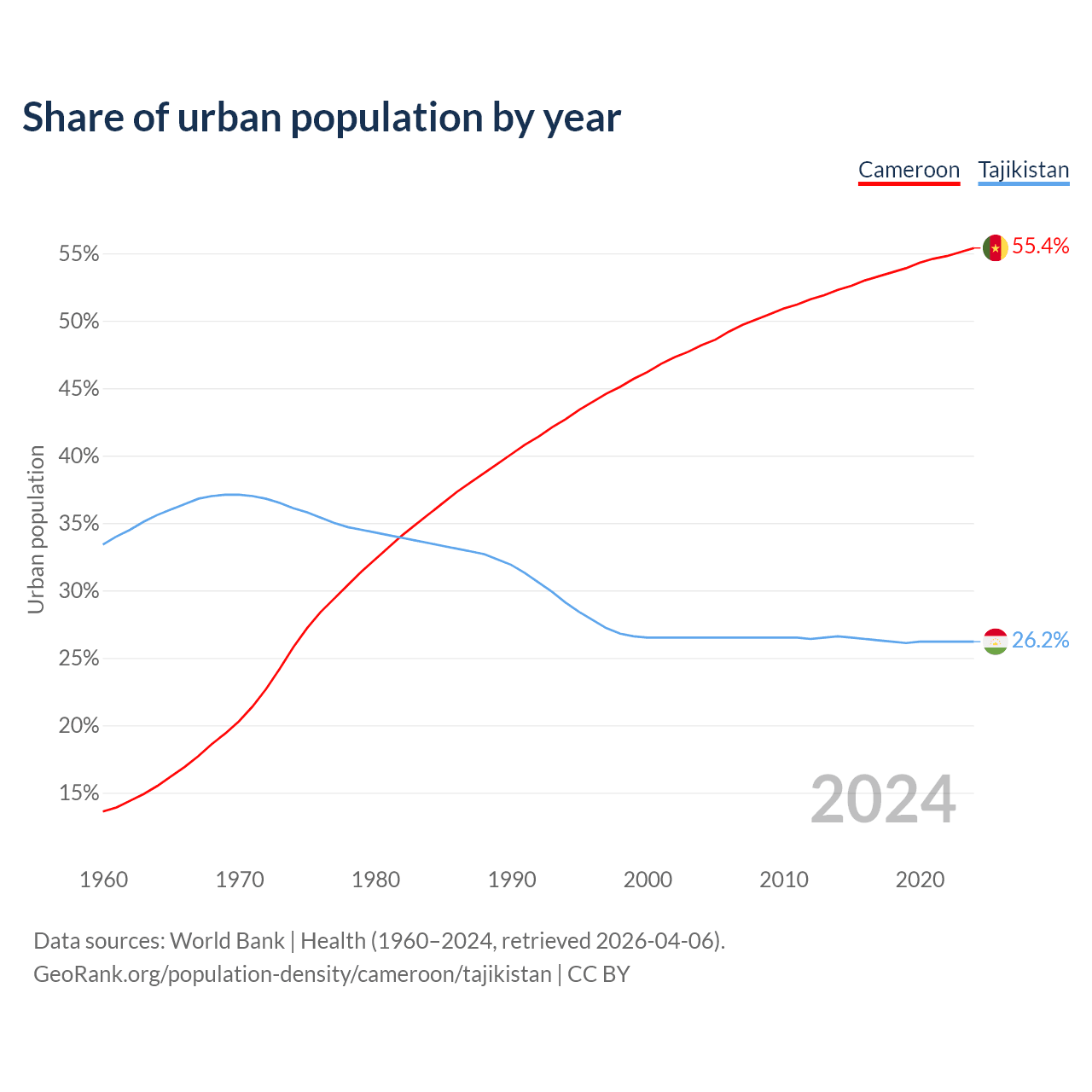 From 2004 to 2024, the share of urban population changed from 48.2% to 55.4% in Cameroon and from 26.5% to 26.2% in Tajikistan.