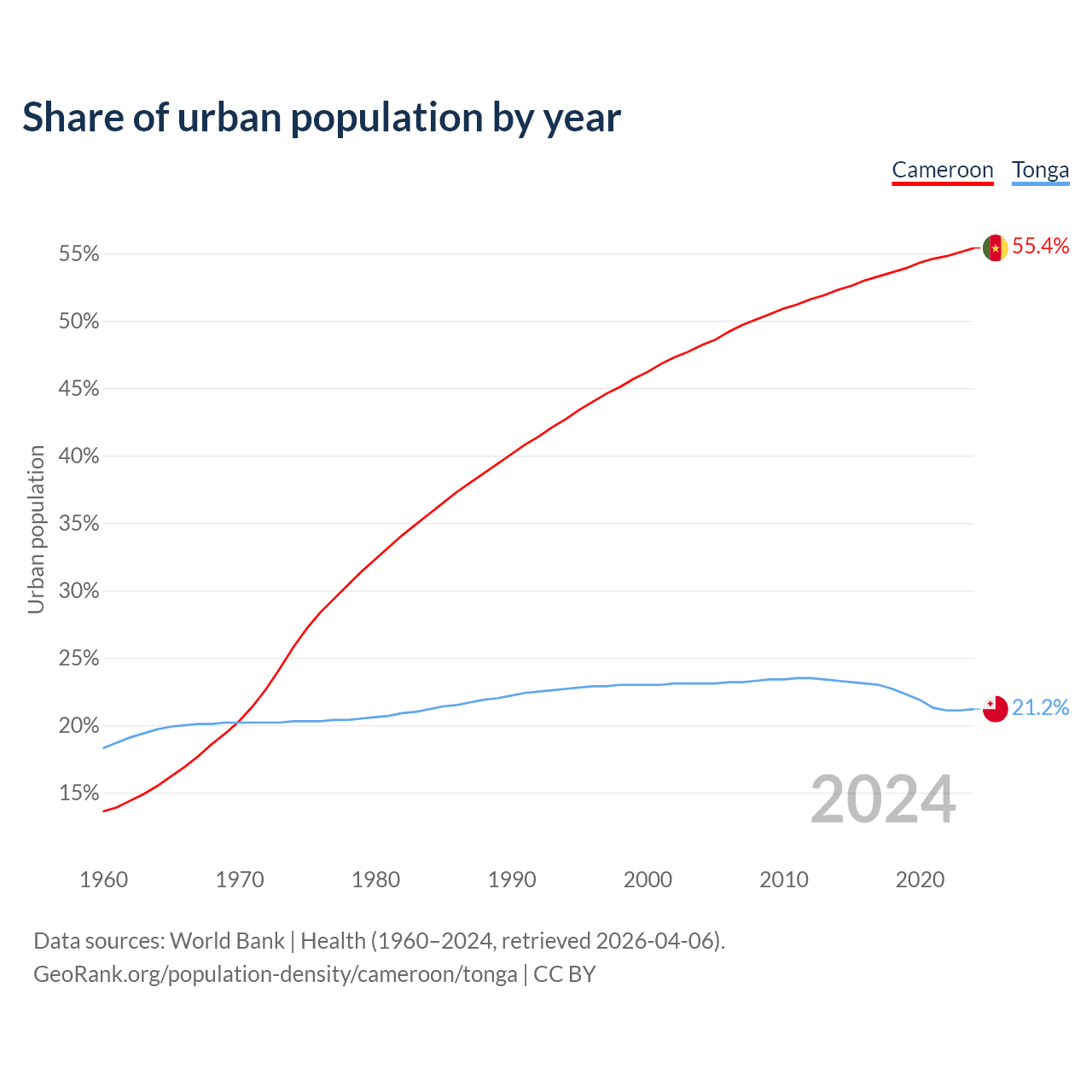 From 2004 to 2024, the share of urban population changed from 48.2% to 55.4% in Cameroon and from 23.1% to 21.2% in Tonga.